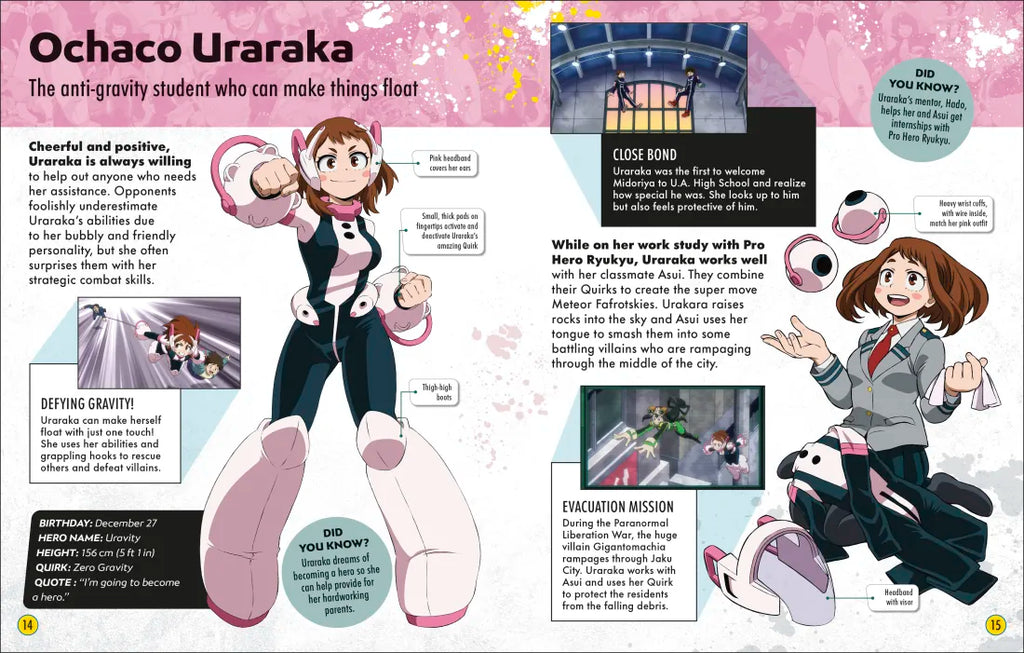 - Meet more than 100 characters from the anime – each character's page features their Quirks, unique outfit details, fun facts, quotes and dynamic stills of key storyline moments