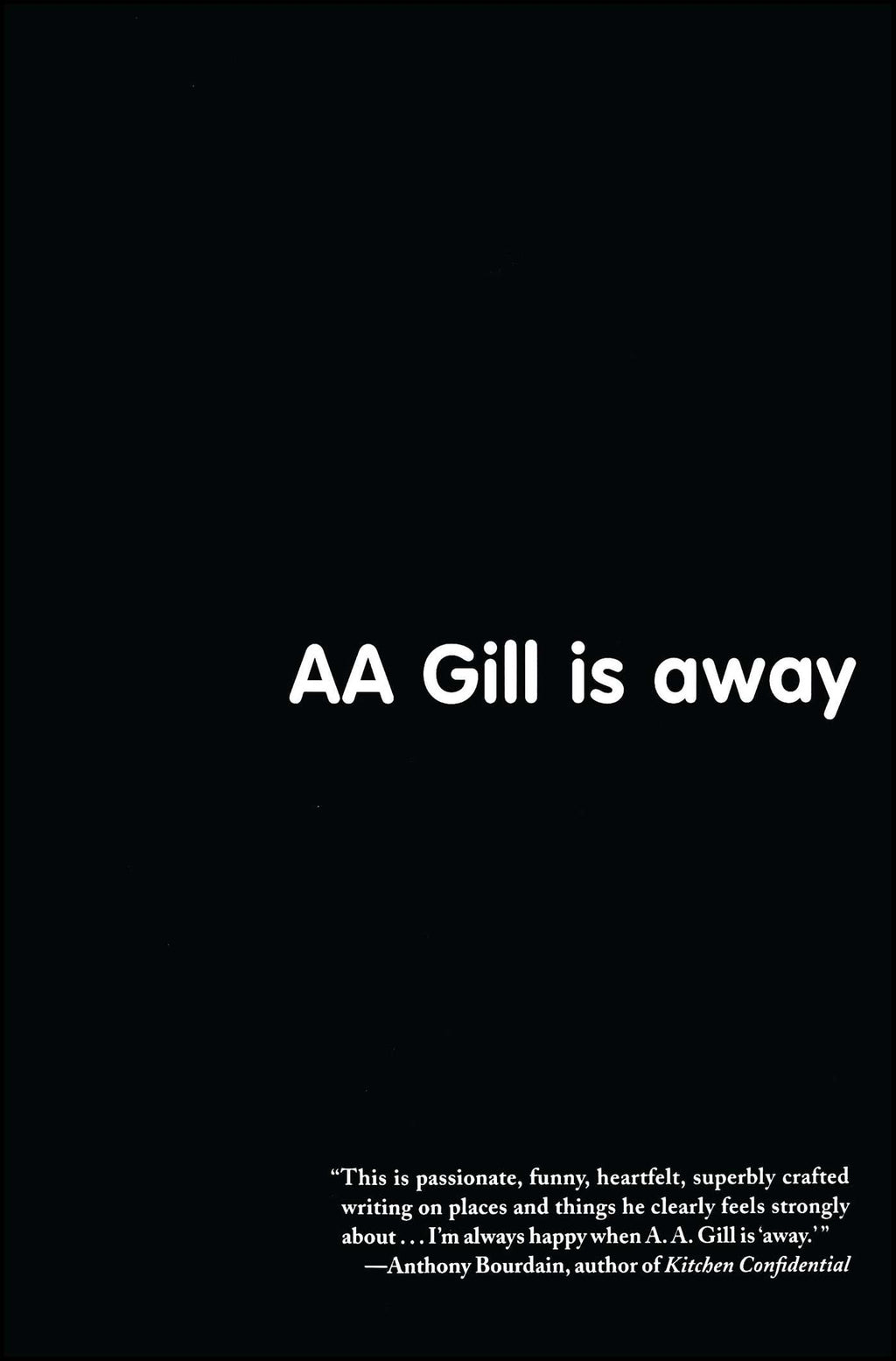A. A. Gill is one of the most feared writers in London, noted--according to the New York Times--for his "rapier wit." Some even consider the mere assignment of a subject to Gill a hostile act. But when the notice "AA GILL IS AWAY" runs in the Sunday Times of London, the city can rest peacefully in the knowledge that the writer is off traveling.