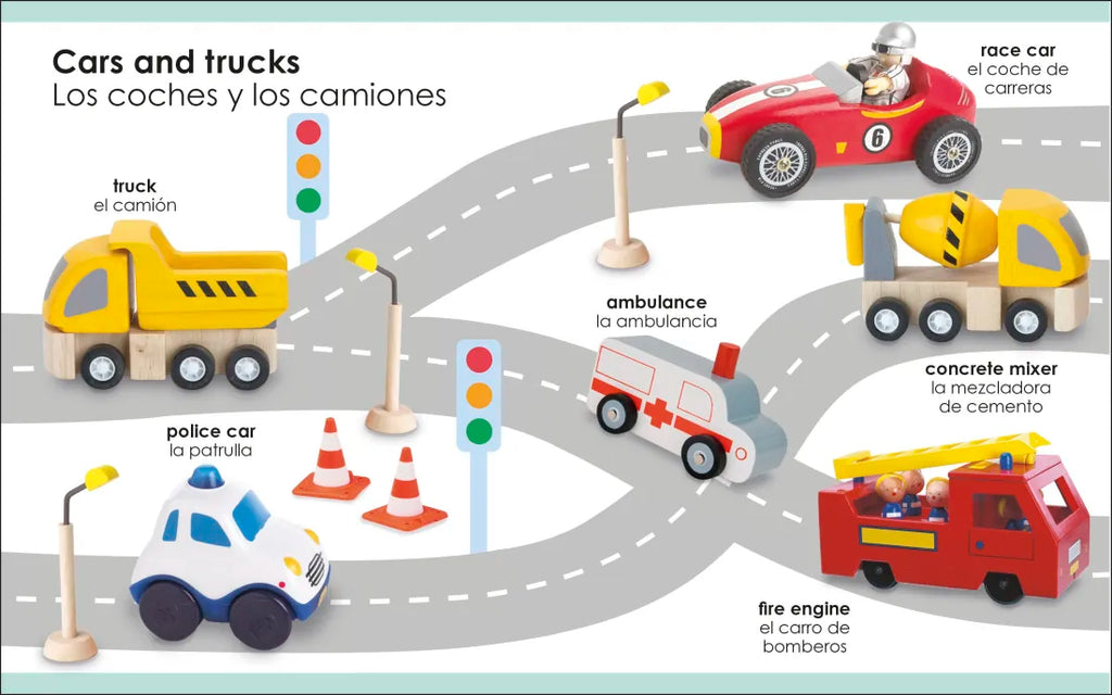 Camiones, bloques de construcción, peluches, disfraces, muñecas, plastilina, cometas… y ¡hasta trompetas y xilófonos! No falta ninguno. Anima a tu bebé a recorrer las páginas del libro e identificar los juguetes que más le gustan. Practicad juntos buscando y nombrando las imágenes en inglés y español. ¡Le encantará aprender el nombre de sus juguetes preferidos!