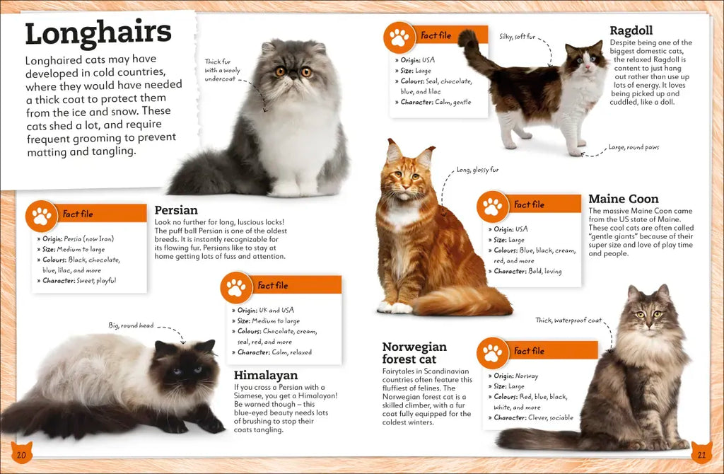 Children aged 5-7 can learn about the profiles of 45 different cat breeds, such as the British Shorthair, Bombay, Siamese, Munchkin, Snowshoe, and more. Young cat lovers will enjoy finding out how cats evolved from wild animals to become pets, and get an insight into their eating habits and preferences as well as how to care for them.