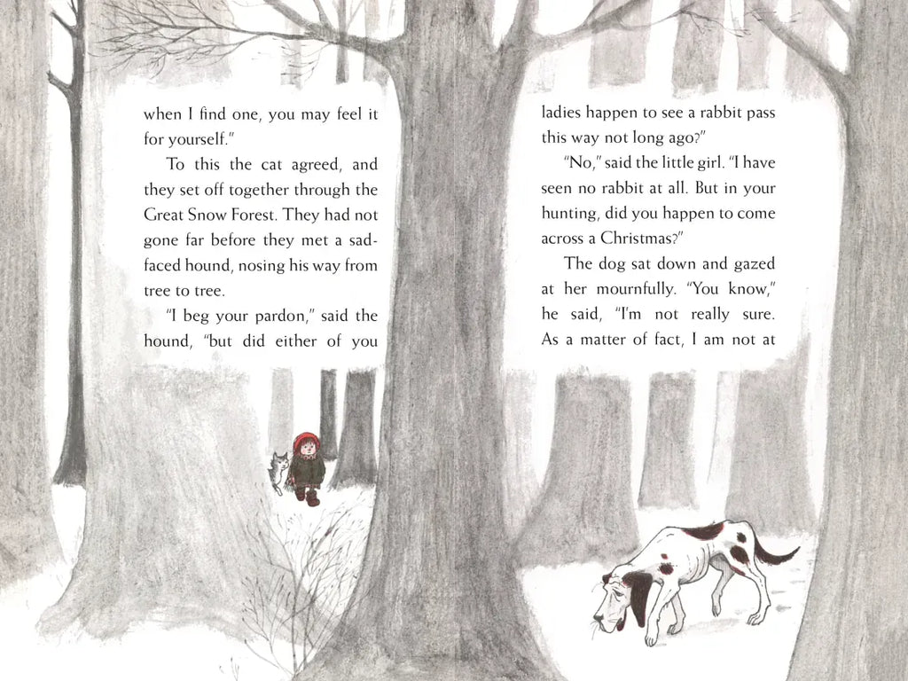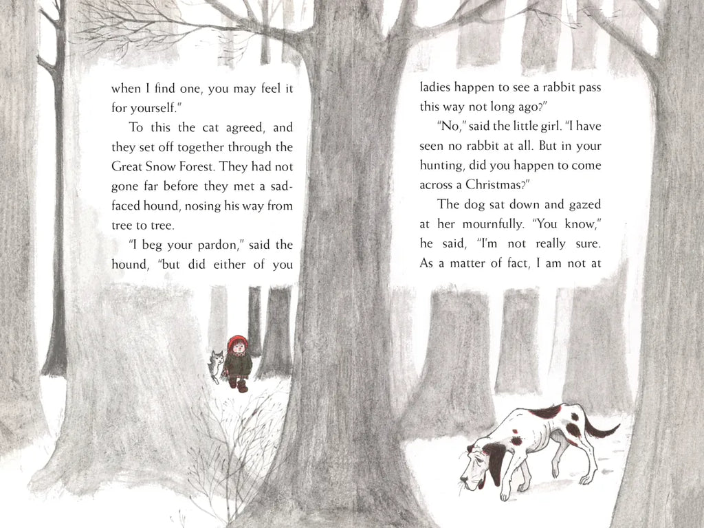 Once upon a time there was a little girl who had never heard of Christmas and therefore did not know what it was. So she sets off into the snowy woods in search of it, gathering a memorable troupe of animal companions along the way: a curious cat, a sad-faced hound, a regal hawk, a wise old fox, and an amusing nightingale.