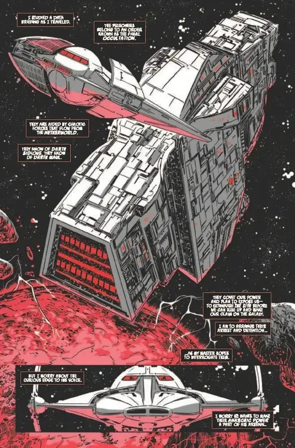 One of the most famous villains in Star Wars lore leads epic tales illustrated in stark black and white — and his own iconic red! When a prison ship — transporting a cult known as the Final Occultation — goes offline, Palpatine sends Darth Maul to investigate. What he finds on board is the stuff of nightmares! On another mission to conquer a mining colony singlehanded, unexpected opposition leads him into an intense battle of life and death — and Maul learns one of his most valuable lessons! He may be fiercely loyal to his master and a true believer in the Sith, but will a journey to a remote moon change his mind? And why has Palpatine sent his apprentice to an ancient world? Who will pay the price for patience?