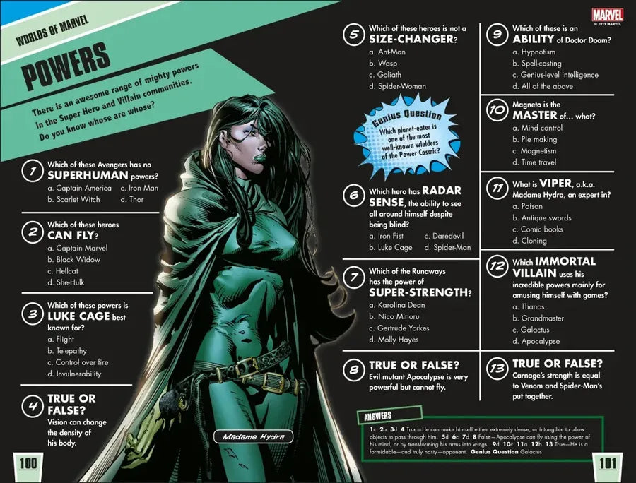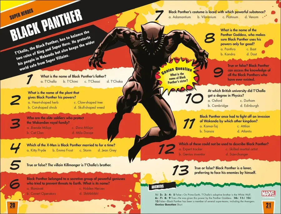 Marvel them with brainteasers: What country is ruled by Black Panther? What powers the Iron Man suit? Where does Groot come from? Can you name Doctor Strange's secret sanctum? Discover the answers to these questions and many, many more.