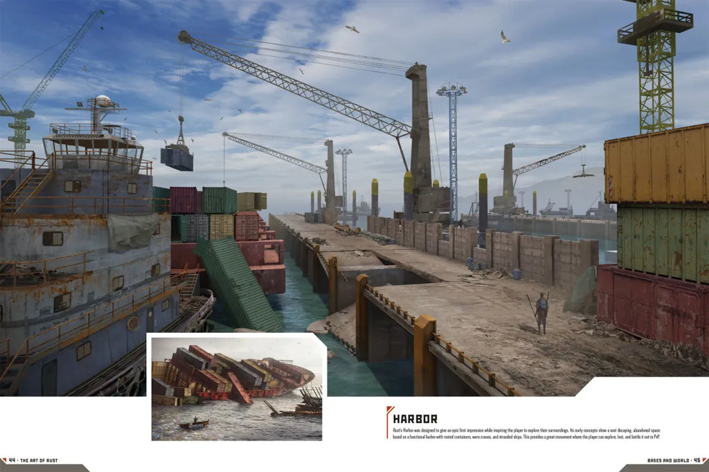 Examine the inventive costume designs and unique characters, experience the expansive and harsh environments, and dive into the details of the improvised weapons, base props, and vehicles of Rust.