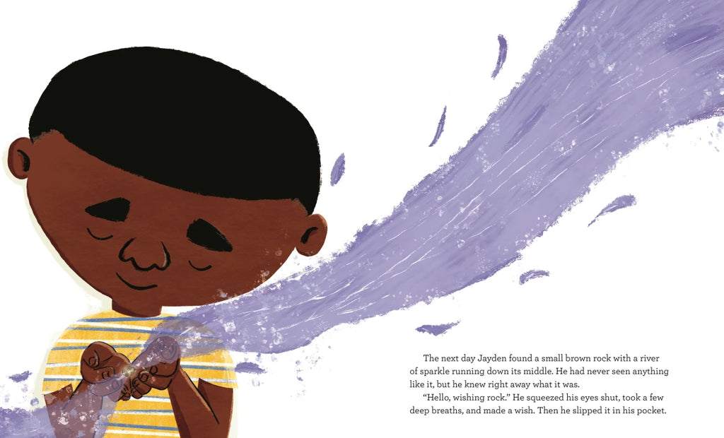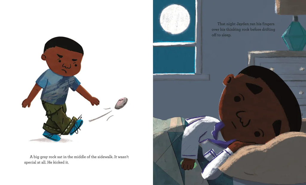 Jayden notices everything. He notices the way the moon looks different every night as it peeks through the oak tree. He notices spiderweb wheels and egg freckles, mouse paws and rose petals. But most of all, Jayden notices rocks. Jayden collects a rock to go with everything: a homework rock, a Saturday rock, even enough wishing rocks to fill up a jar. But now that he and his family have moved to a different house, where the trees are too short, the color is off, and the mailbox is in the wrong place, will he find a rock to grant him courage—and help him make a new friend, maybe even a noticer like him? In a tender story for curious and observant little readers, Carolyn Crimi’s text joins with Shamar Knight-Justice’s expressive illustrations in a tale that offers comfort in the face of life’s many changes.