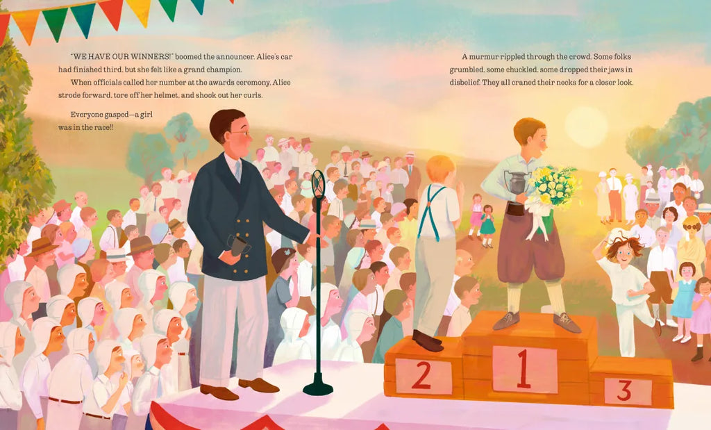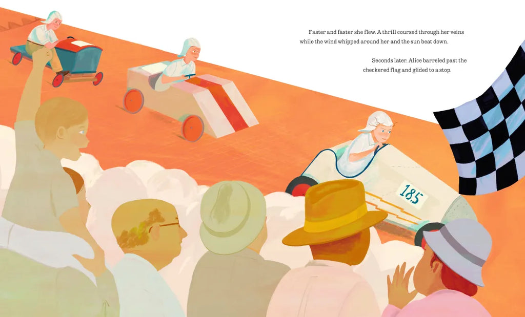 Alice loves swooping through the clouds in Daddy’s biplane. She and he even flew through a howling tornado when Alice was only three! Grounded now by the Great Depression, Alice is yearning for more thrilling adventure when she sees a newspaper ad for a soap box derby where kids will race their own homemade, gravity-powered cars. Excitement is spreading like prairie fire! But wait—the race is only for boys? Alice knows she can be a race-car driver, too. So she and Daddy work hard in his machine shop to build the speediest car they can. Ball bearings let the wheels spin smoothly, rubber tires absorb bumps in the pavement, sleek surfaces slice through the air, and the crowning glory: an airplane’s nose cone! The day of the race, forty thousand people turn out to watch hundreds of boys compete—and one Mystery Driver. At the crack of the starter pistol, Alice flies toward the checkered flag . . . Get ready for an action-packed story complete with fascinating back matter that digs deeper into the science and people involved.