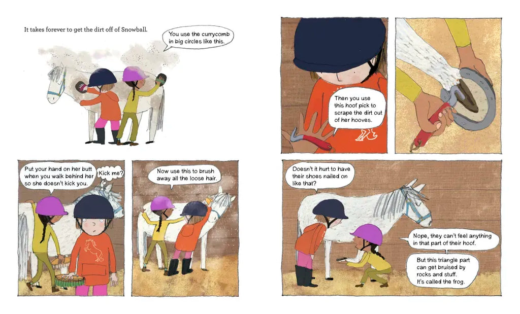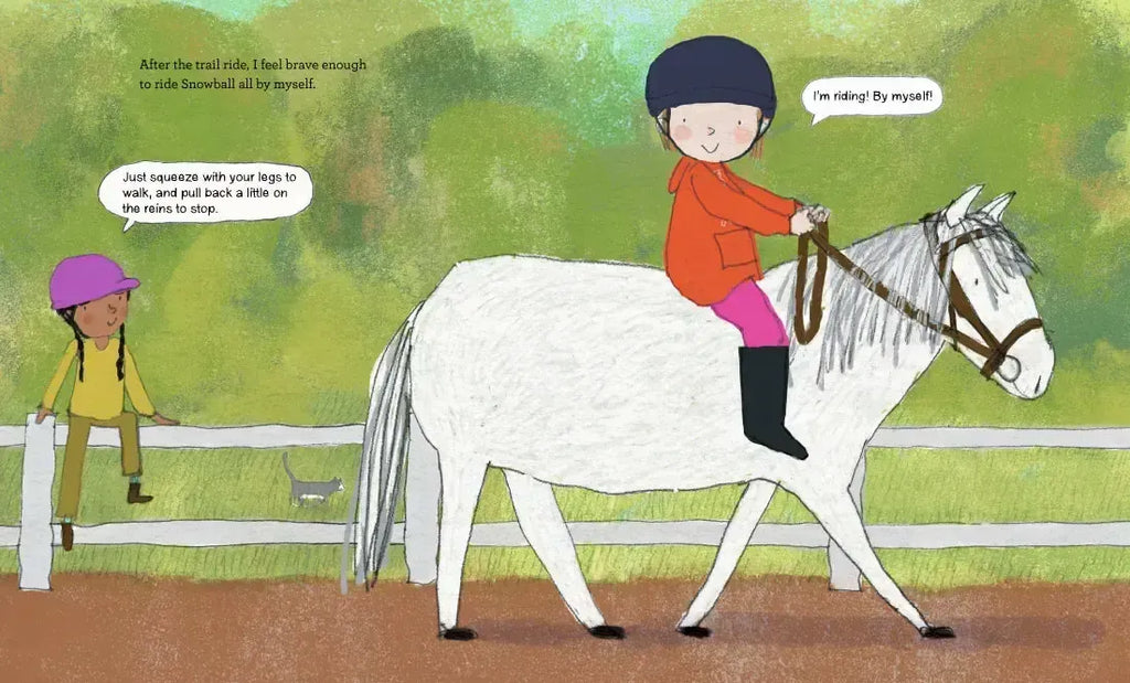 Frances adores horses and knows everything about them – at least she thinks she does. But when she arrives at her friend Mae’s house for her first horseback-riding lesson sporting a bike helmet and wellies, Frances quickly discovers that she might not know as much as she thought she did. Barns are actually a little stinky, and it takes a lot of time to brush a horse and tack it up (what does that even mean?). Not to mention that horses are much bigger in real life, and being so far off the ground can be scary! Will Frances be brave enough to ride Snowball all by herself, or will it be too different from what she’s imagined?