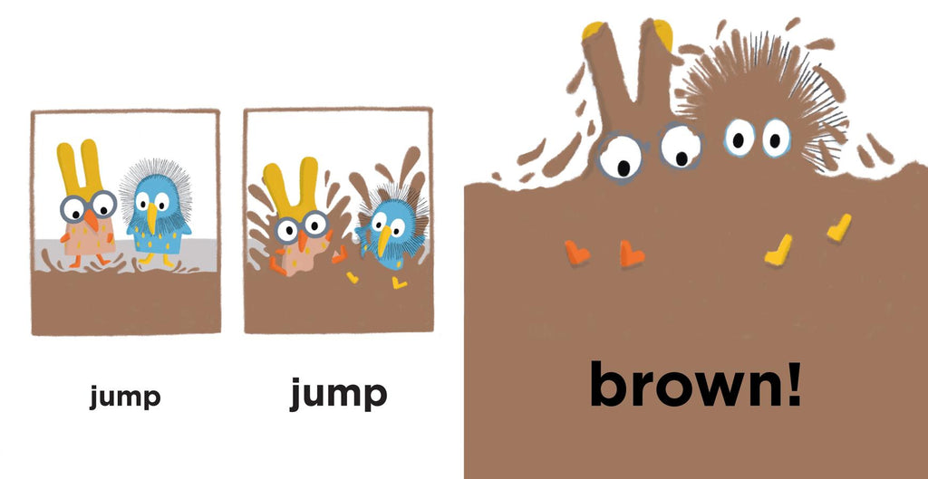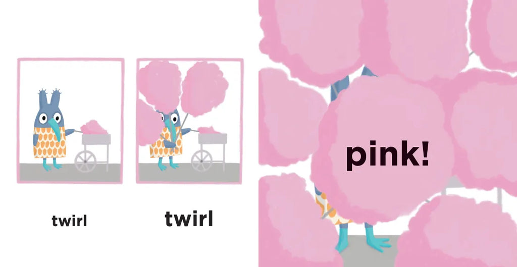 When Smushkins shake a brilliant autumn tree, what do they get? A massive pile of red leaves to jump into! When a Smushkin twirls some cotton candy at the fair, what comes next? A cloud of pink! In a Smushkin’s world, dogs dig up bones in white snow, painters paint themselves into a purple corner, and friends jump together into luscious brown puddles. Reading a bedtime book might lead to a sleepy black doze, but check out the multicolored celebration with all the Smushkins at the end. Claudia Rueda mines the world of the familiar as her gentle characters introduce a rainbow of colors to the youngest of readers.
