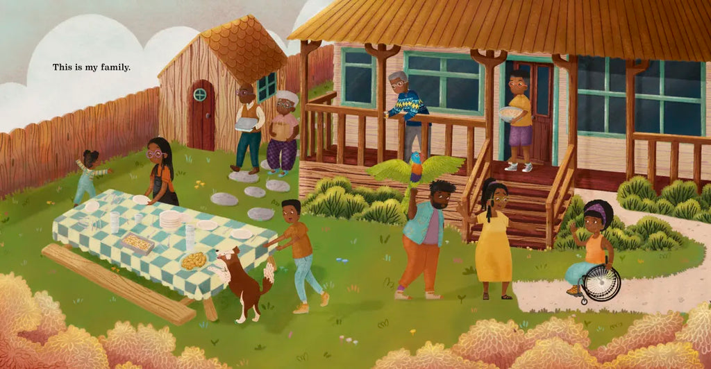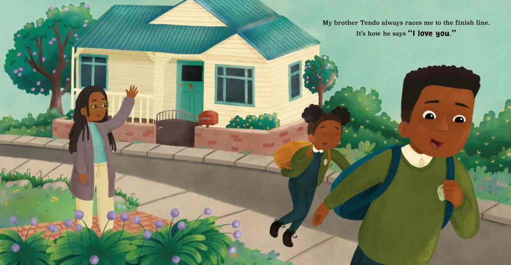 Tendo always races his sister to the finish line as they leave the house. Kira the dog greets her at the door with a wagging tail and a spin. Sometimes it’s Auntie Linda pulling her into her wheelchair for a hug, or Uncle Alex bringing his funny parrot for a visit. One jajja teaches her granddaughter how to make the chicken dish she learned as a child; another tells stories from far away, before she was born. Whether it’s Mom asking if she’s hungry a hundred times a day, or older siblings scaring away the monster that keeps her awake, the refrain “I love you” comes through loud and clear—and reminds us that there are countless ways to express affection to those that we hold dear.