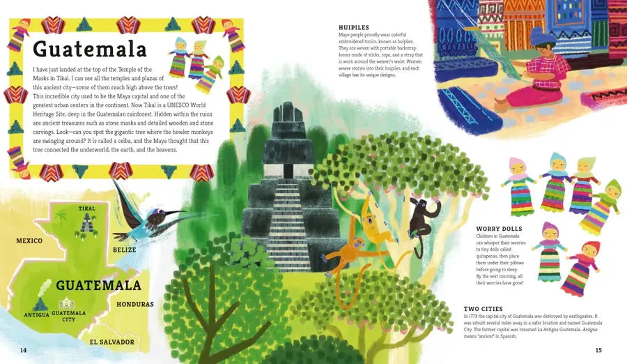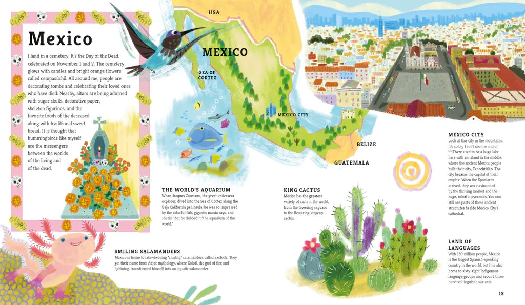 Thousands of years ago, early humans crossed an icy land bridge between what is now Siberia and Alaska onto the American continent, gradually migrating south to build vibrant new societies and cultures, erect pyramids and great cities, and cultivate foods like maize, potatoes, tomatoes, and chocolate that still grace our tables today. Join a tiny migrating hummingbird for an enchanted tour of the dazzling biodiversity and human history of Latin America and the Caribbean. In spread after color-splashed spread, our bejeweled guide traverses volcanoes and barrier reefs to reveal howler monkeys and singing frogs, manatees and macaws, anteaters and alpacas. Ranging from the Amazon, our planet’s largest rainforest, to the Andes, Earth’s longest continental mountain range; from the magnificent civilizations of the Mayas, Aztecs, and Incas to the conquistadors and modern struggles for independence; from the sugar skulls and candle-lit cemeteries of Mexico’s Day of the Dead to Carnival in Brazil; and from cricket and football to salsa, reggae, and calypso, this friendly tour spiced with bright illustrations, maps, and an index offers young readers a taste of the extraordinary richness of this captivating part of the world.