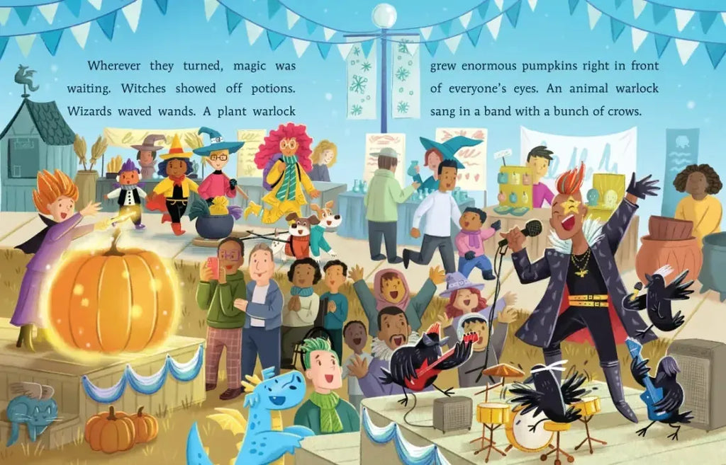 Everyone in Inkwell is excited for the Winter Solstice party, including magical puppies Hocus and Pocus. Pocus wants to play in the snow, and Hocus wants to eat snowflakes! Finally, the longest night of the year arrives and everybody turns out to celebrate with maple popcorn, hot cider, and enormous pumpkins (thanks to a plant warlock). The only thing missing is—snow! Without a fresh dusting, how can Hocus and Pocus’s friends make snow sculptures and race snowflakes? The puppies notice a new striped tent at the edge of the party: Nimbus the Sorcerer! Handmade Wishes! Hocus and Pocus know just what to wish for. Nimbus pulls a tiny snowglobe from behind their back, and says to be careful—this is a very big, very delicate wish. The puppies try, but their excitement gets away from them, and soon it is TOO snowy for the party (and Hocus’s feet are pawsicles!). Luckily, the citizens of Inkwell have a few cozy charms up their sleeves. This latest adventure glows with warmth and winter magic.