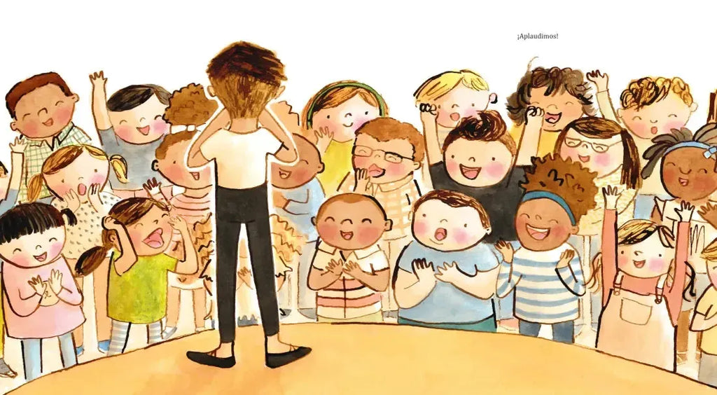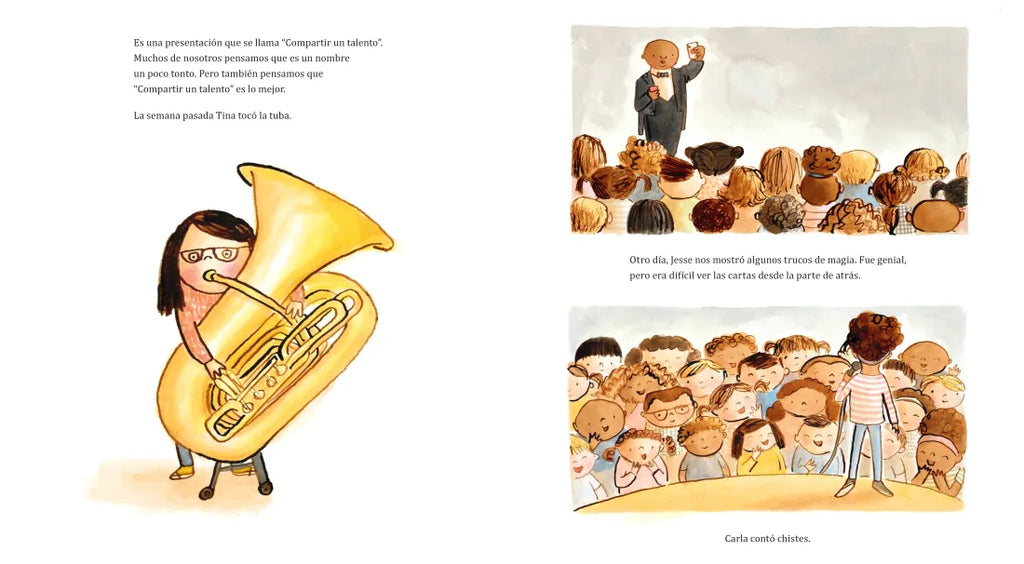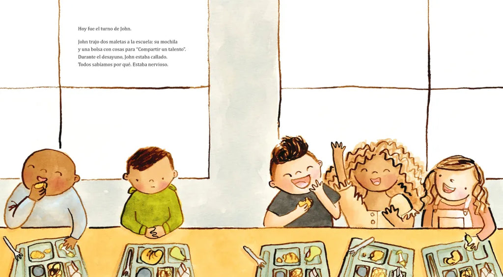 Hoy es un gran día para John en la escuela: es su turno en la hora de Compartir un Talento. Ha preparado y empacado su bolsa cuidadosamente, sus compañeros de clase están listos y están esperando a que suba el telón. John está nervioso, pues ve que todos los otros niños lo están observando. Pero él respira profundo y comienza. El texto apasionado de Mac Barnett, junto al arte sencillo y expresivo de Kate Berube, cuentan la historia de un niño que tiene el coraje de mostrarles a los demás su talento para el baile.