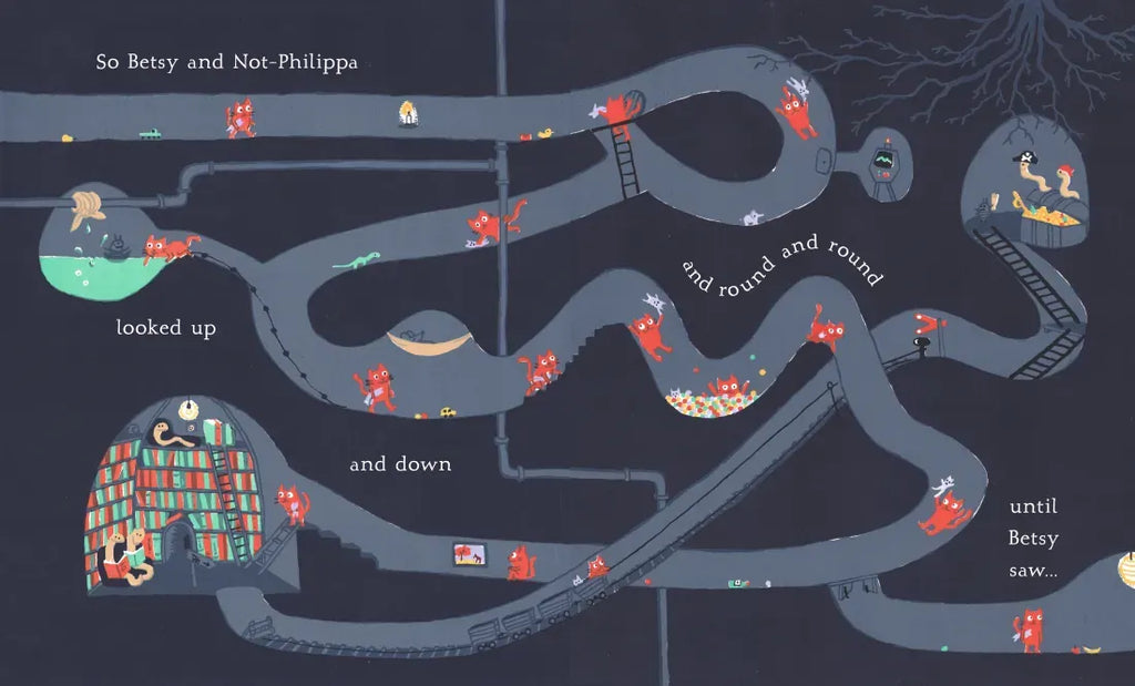 Then something comes out of the hole. It is a banana. Followed by a number of other unexpected items. Betsy is content to watch what happens, but when Philippa disappears down the hole, Betsy has to go find her. From master picture book creator Daisy Hirst comes a story of friendship and sharing, and realizing that more is indeed merrier.