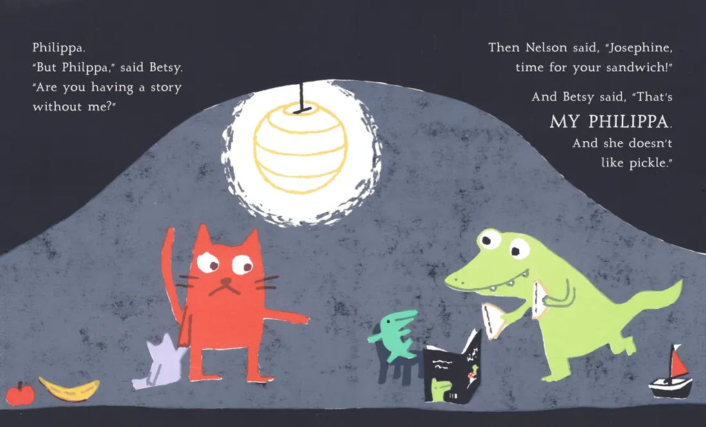 Betsy and her stuffed crocodile Philippa are out on a walk, when Betsy points to the ground. "There is not usually a hole."