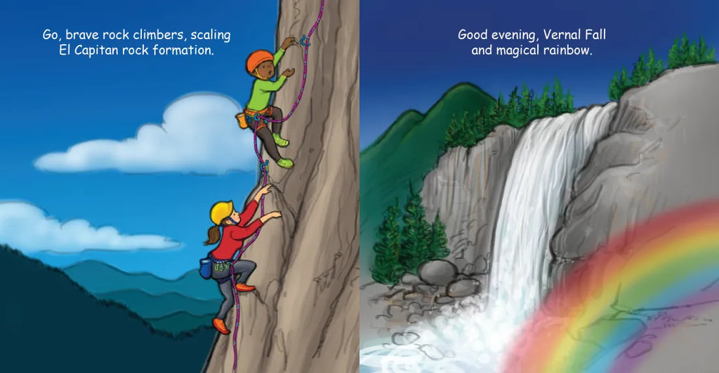 Good Night Yosemite highlights the Half Dome, Vernal Fall, El Capitan, Glacier Point, Yosemite Valley Visitor Center, Indian Rock, giant sequoia, black bears, mule deer, mountain lions, wildflowers, park rangers, fishing, camping, hiking, and more. Young explorers are treated to an enchanting tour of one of the greatest parks and most scenic parks on earth. Children who know the park are sure to recognize their favorite sights, attractions, and wildlife.