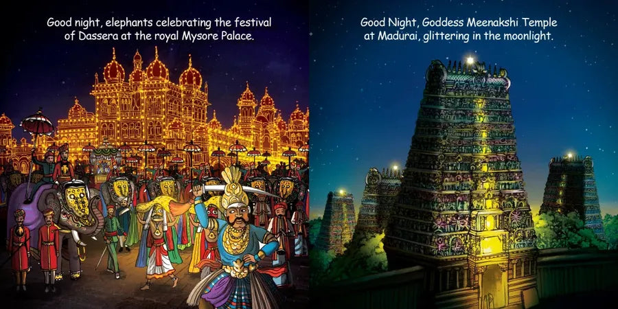 Good Night India highlights the Himalayan Mountains, Golden Temple, Valley of Flowers National Park, Palace of Winds, Hawa, Mahal, Mehrangarh Fort, Goa, beaches, dolphins, lions in the Gir Forest, tigers in the Sundarbans, Darjeeling tea, blue train, elephants, and more. This charming board book invites young readers on an exciting and educational tour of one of the world's most interesting countries: India.