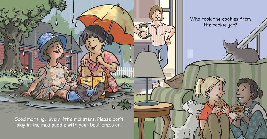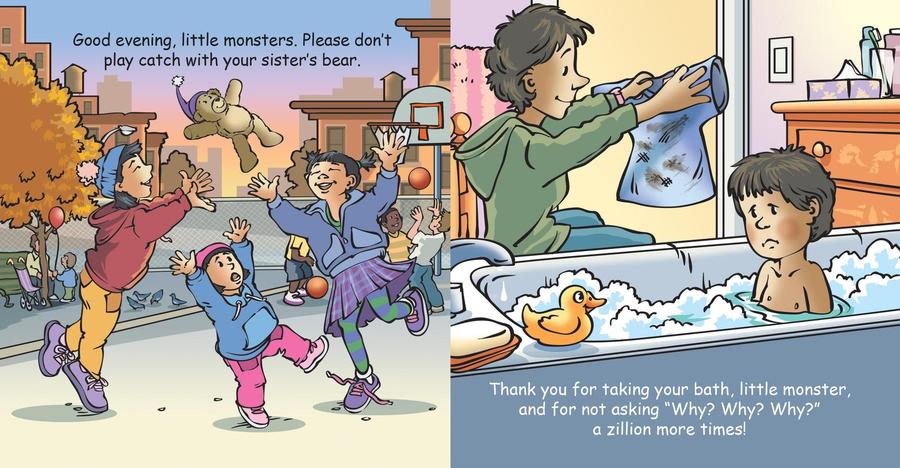 The hilarious little monsters in this good-night bedtime book come neither from Frankenstein’s laboratory, Loch Ness nor the Black Lagoon. They are neither zombies nor vampires, werewolves nor ghosts! They are our very own beloved children themselves... when they allow their mischievous natures rule the day. Lessons of politeness, kindness, and compassion are taught through silly slapstick humor in this ironic addition to the popular Good Night series. Little ones are encouraged NOT to drink from the maple syrup bottle at the breakfast table, NOT to play in mud puddles while wearing their best dresses, and NOT to tickle their little brother's during naptime. They are asked politely NOT to play ball in the house, NOT to take cookies from the cookie jar without permission, NOT to dress the dog in mom's favorite outfit nor to put lipstick on dad while he’s napping on the couch. You'll have to read the book yourself to find out if these troublesome tots will or will not "please, please, please turn of the light, and say good night!”