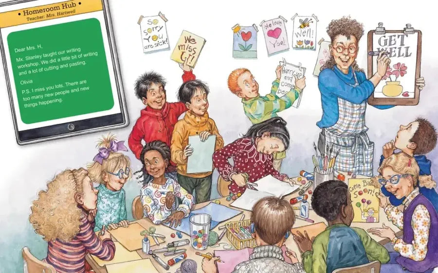 When the substitute teacher doesn't show up, the other adults in the building pitch in. The art teacher runs a writing workshop, the school nurse teaches science, and the math teacher leads reading! Alternating perspectives show the day from the students' point of view and from Mrs. Hartwell's as the kids keep her informed through a flurry of humorous electronic updates.