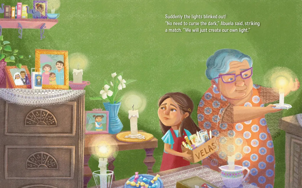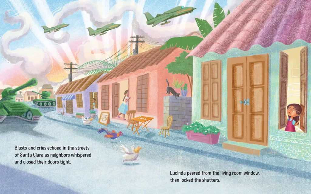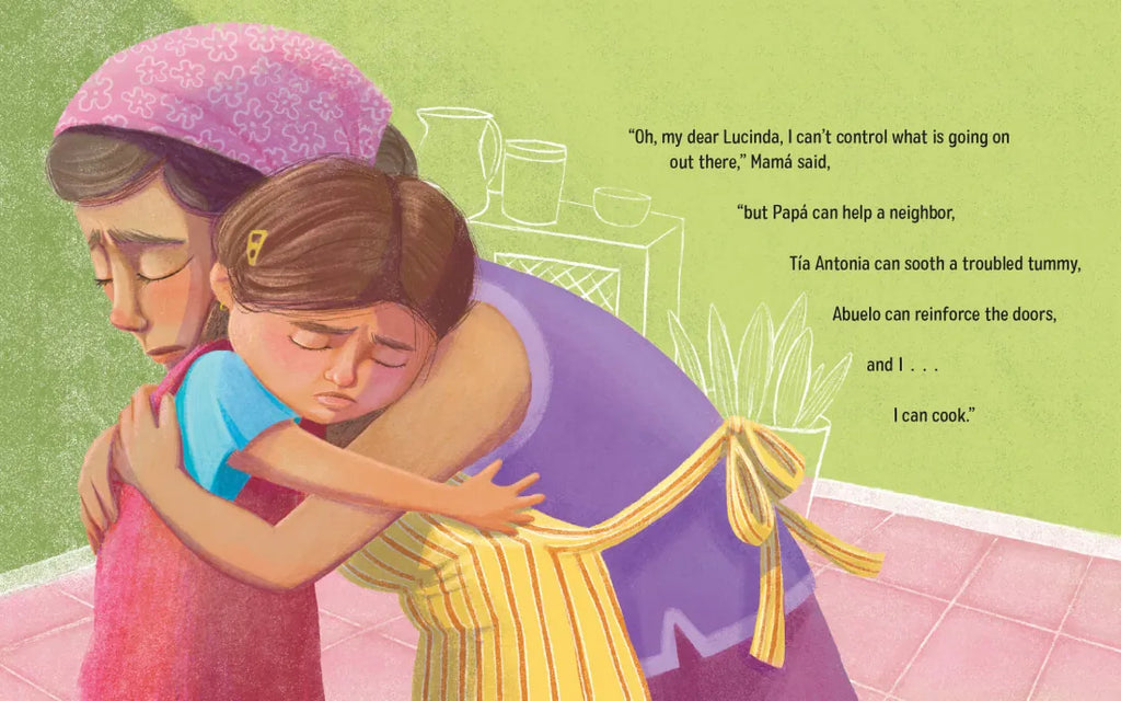 When military violence erupts in the streets outside Lucinda's home, the family joins together, pushing furniture against doors, filling cracks with wet napkins, and lighting candles when met with darkness. Amidst the blasts and cries, Lucinda's heart taps against her chest. Mamá's spoon taps against her sizzling pan. How can she cook when so much is happening outside?