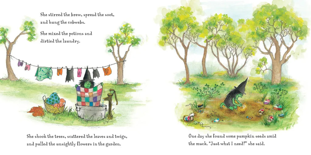 The little green witch has a problem: her lazy monster friends just won't help her make a horrible pumpkin pie. Not ghost, nor bat, nor gremlin.