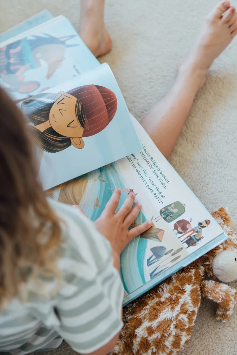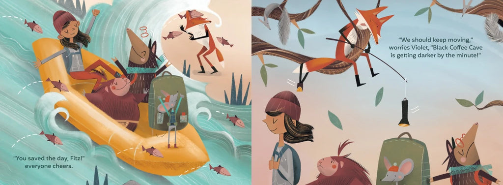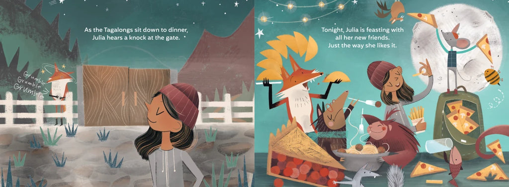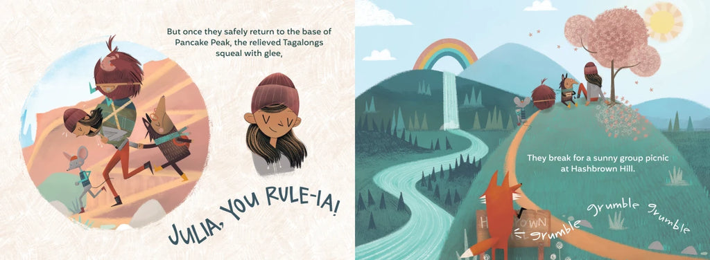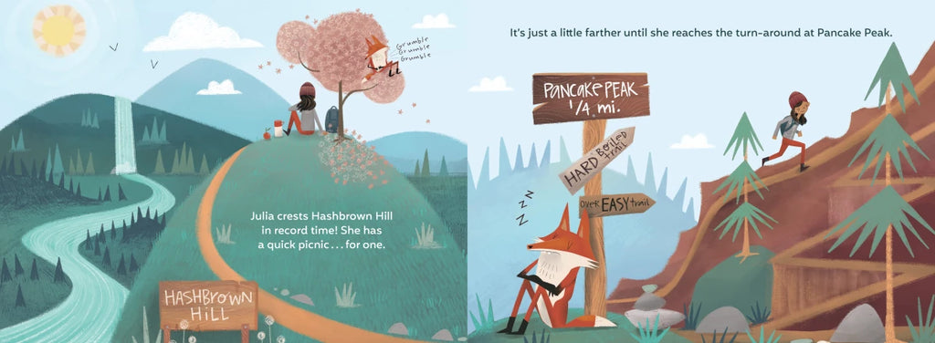 The Tagalongs tells the fun and whimsical story of Julia’s unexpected adventure on a hike to Pancake Peak. As Julia meets, and avoids, and ultimately teams up with an unusual pack of animal friends, the book explores themes of independence, self-reliance, and the enjoyment of the great outdoors. It also highlights the value of diverse strengths, helping strangers, sharing what we have, and including others.