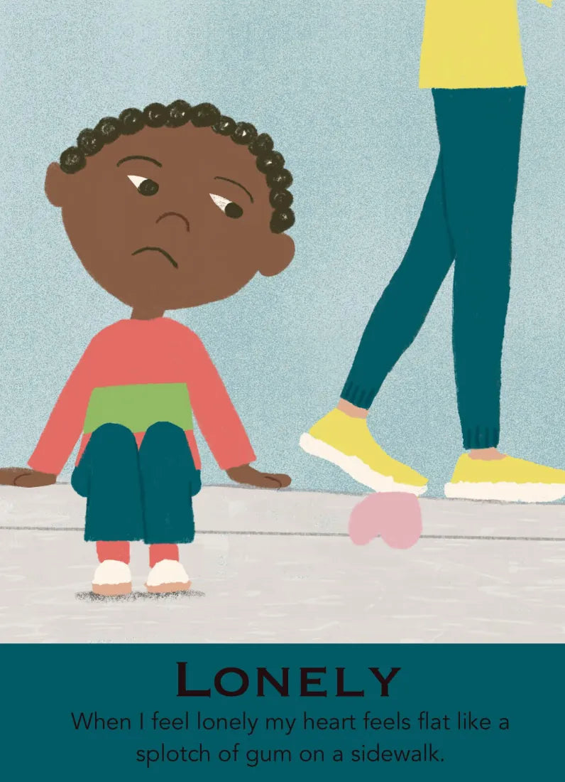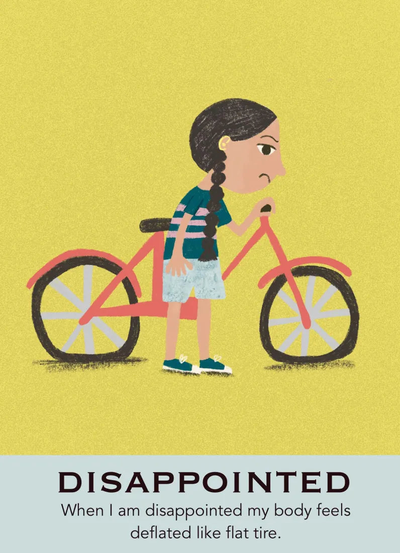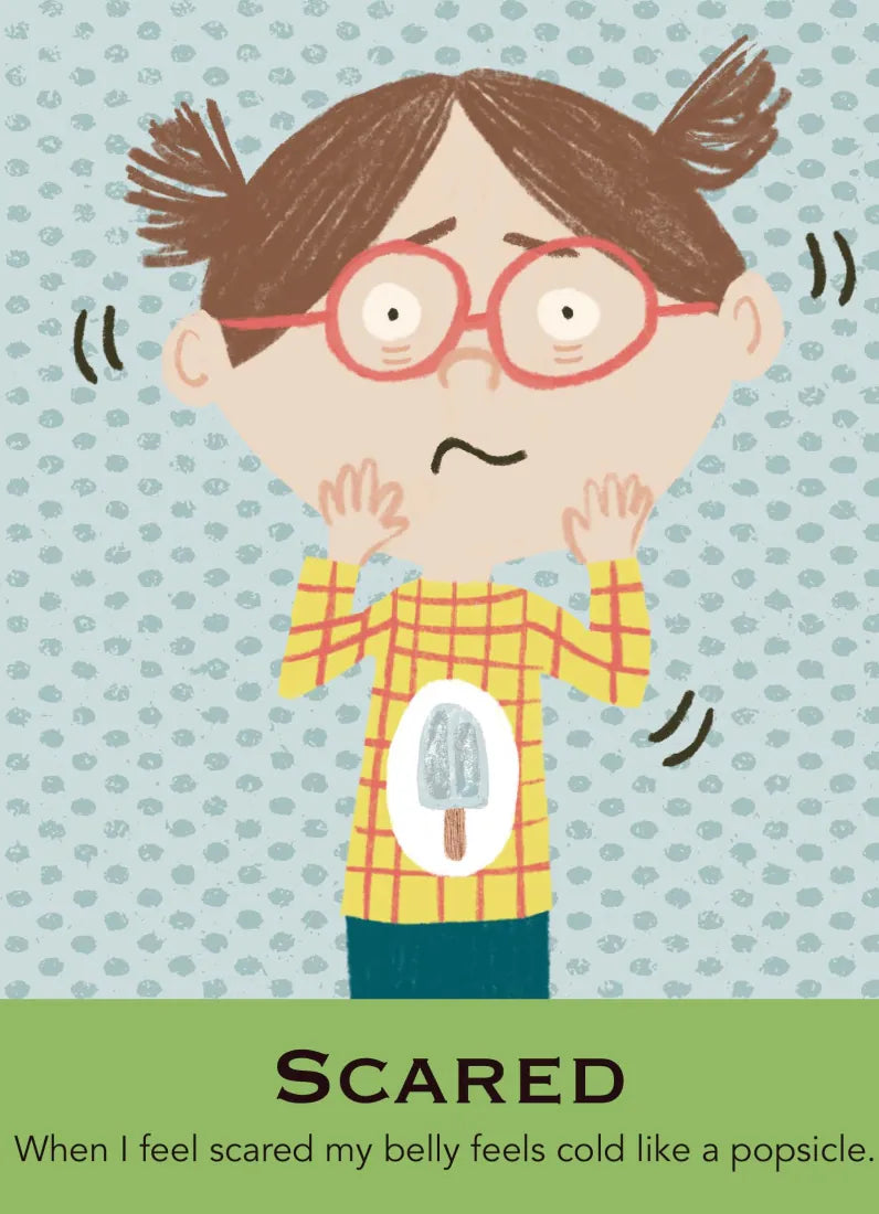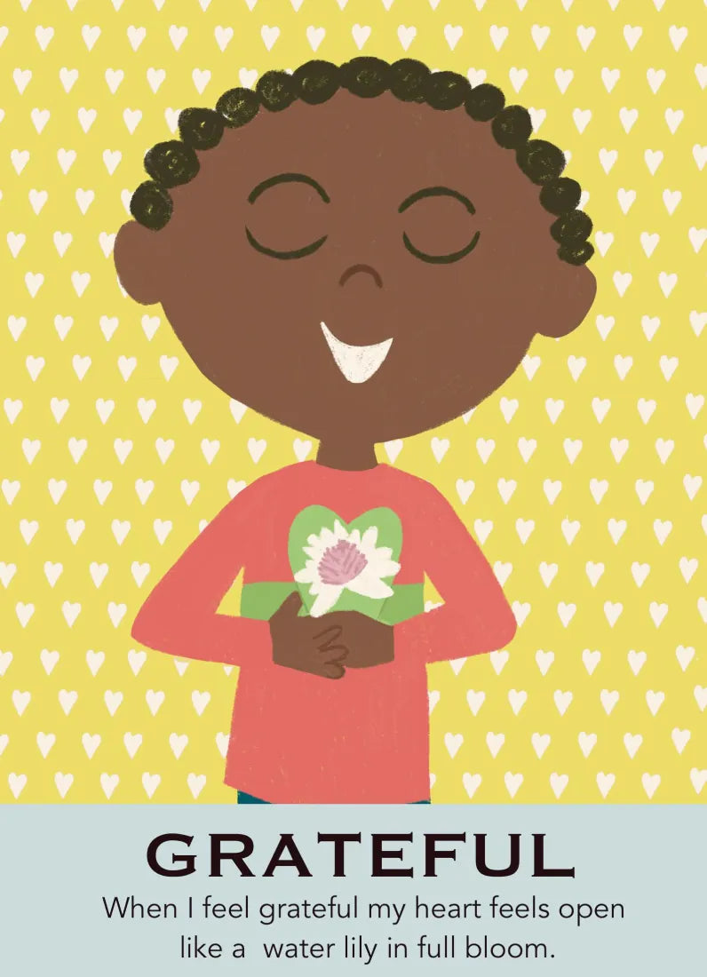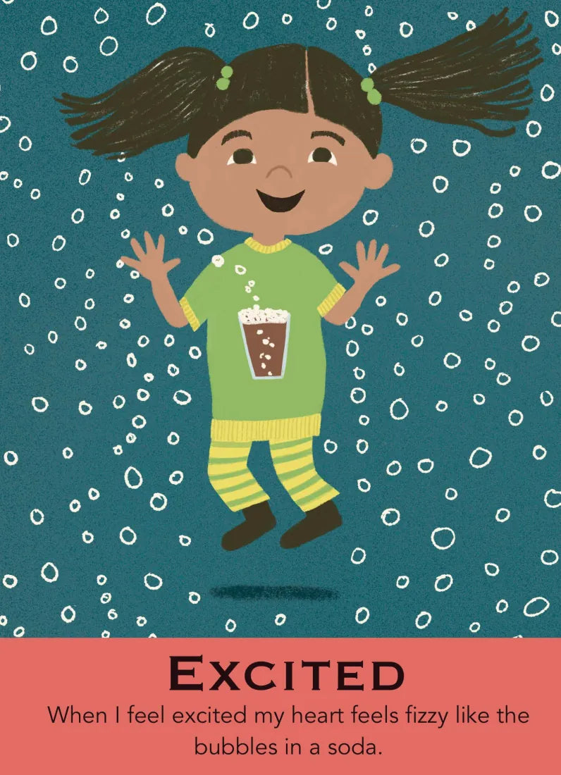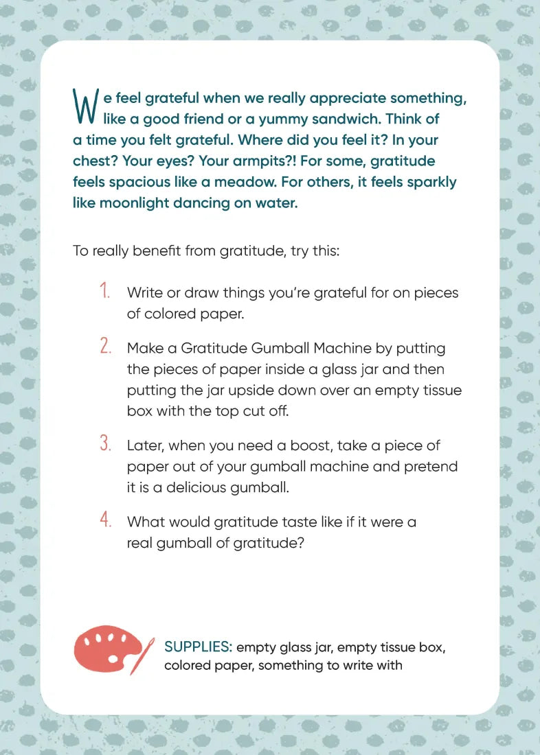 The cards are illustrated with evocative ways that emotions can show up in the body to help kids start to recognize how they embody feelings—for example: “When I am worried, my mind feels tangled up like spaghetti noodles”; “When I feel scared, my belly feels cold like a popsicle”; “When I am excited, my chest feels fizzy like the bubbles in a soda.” The deck includes both meditation cards, guiding kids in simple mindfulness practices focused on the card’s emotion; and activity cards, featuring hands-on activities to regulate emotions like making a calming glitter jar, planting a seed of hope, blowing bubbles of frustration and watching them float away, and creating a “Gratitude Gumball” machine.