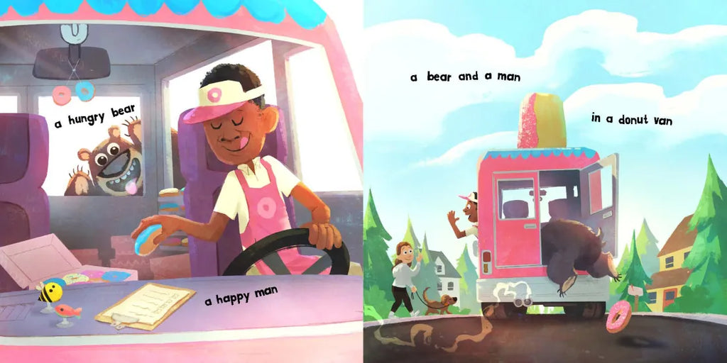 Everyone’s favorite hungry bear is back! This time Bear discovers a van full of donuts -- YUM! Bear climbs in the van, but the unsuspecting donut man doesn't see what's going on. Until... he looks in his rear view mirror, and OMG!!! What should a donut man do when a bear is eating donuts in his van?