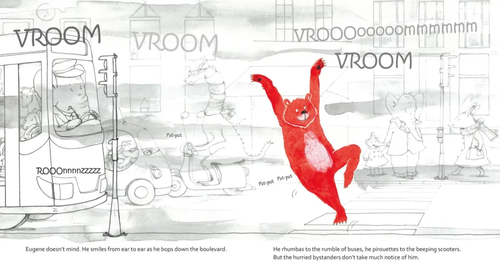 Eugene loves to dance. He loves it so much he'll dance to any noise in the city, whether it be a car horn or a jackhammer. He wishes he could get everyone else to dance along with him, but no one else seems to care. When an evening snow begins to fall, Eugene discovers the magic ingredient that will put everyone in a mood to frolic. Here's a gleeful celebration of the rhythms of daily life, and a lesson in how to find the music that's all around you.