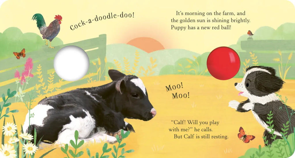 This introduction to baby farm animals, with both illustrated and photographic elements and a touch-and-feel element on every spread, follows the adventures of Puppy as he tries to find a friend who wants to play with his new ball with him.