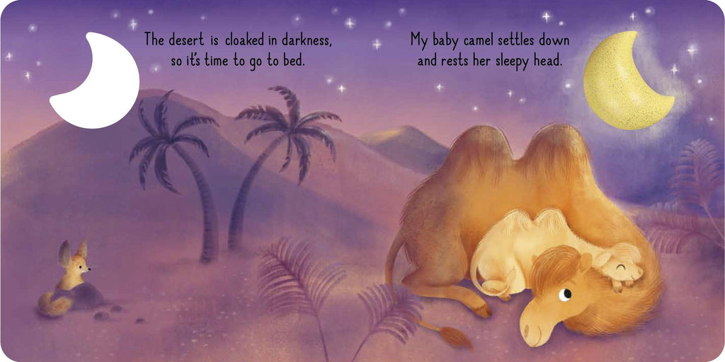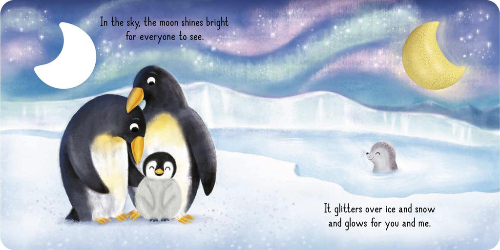 Night falls, and the Moon shines brightly over the Earth as the baby animals settle down and get ready for bed. A penguin chick in the snow, a baby camel in the desert, a panda cub in the bamboo forest, and more babies cuddle up with their parent for the night. Majestic illustrations depict sweet scenes of parent and child snuggling together for the night. Toddlers will love to manipulate the soft and squishy die-cut sparkly moon that appears on every spread.