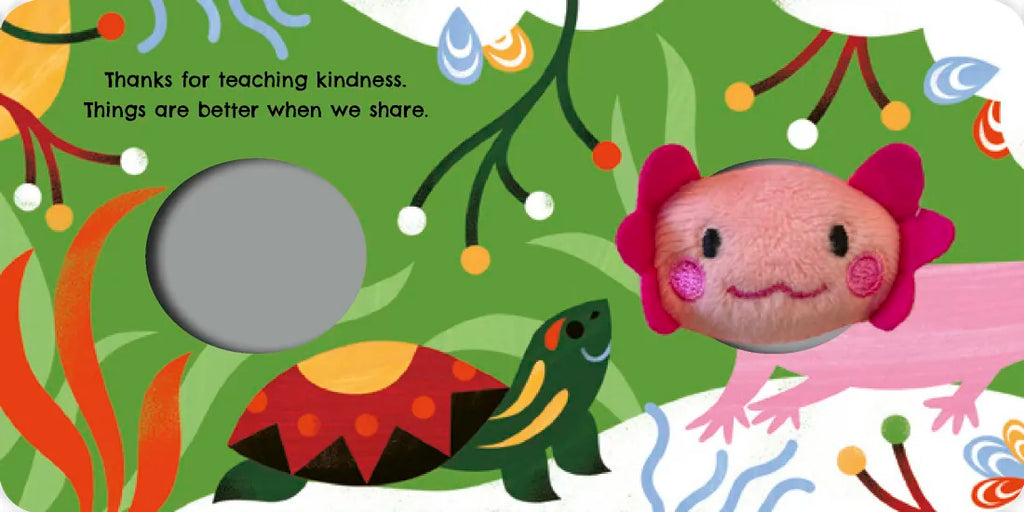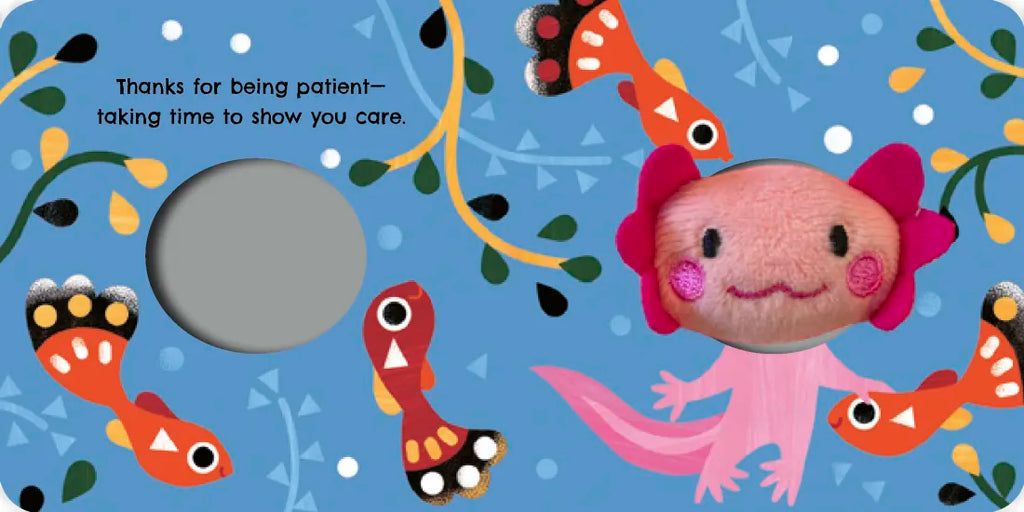 A cozy, rhyming board book for children ages 2-5 with an adorable axolotl finger puppet.