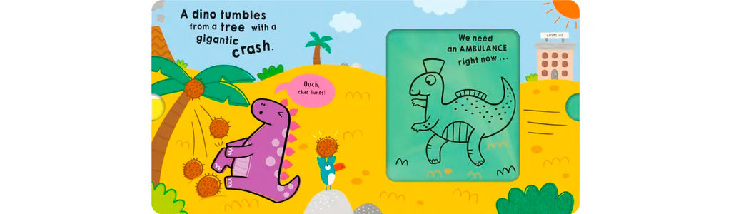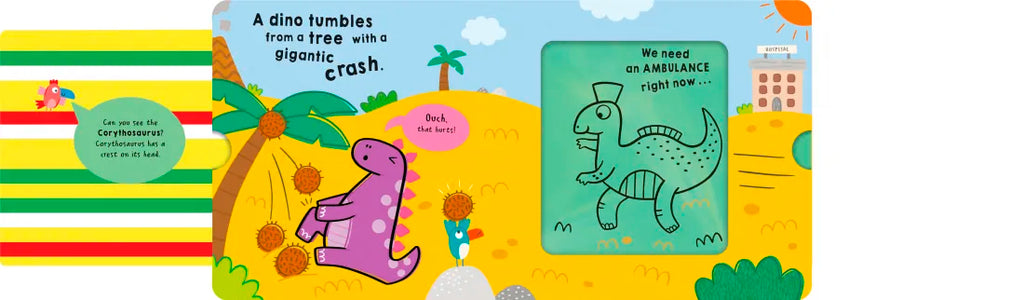 Through magical sliding transformations, see a Corythosaurus become an ambulance, a Pterosaur become a rescue airplane, a Plesiosaur become a rescue boat, and more. This mash-up book is perfect for fans ages 2-5 who love dinosaurs and things that go!