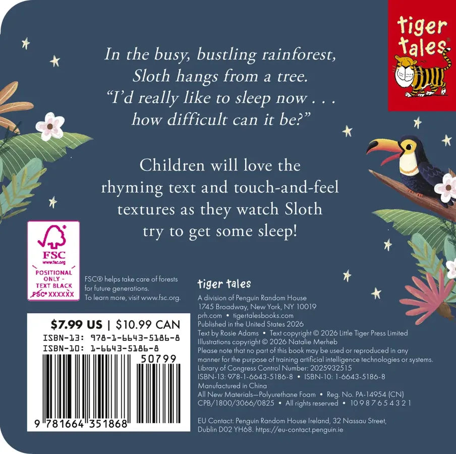 Poor sleepy Sloth just wants to take a nap, but there’s too much noise from his friends in the busy rain forest! Will the soothing chirrup of the tree frog help him fall asleep? This cozy book features simple rhyming text, bold and colorful artwork, a touch-and-feel die cut on the cover and throughout, as well as fun textures to explore, making this the perfect book for toddlers.