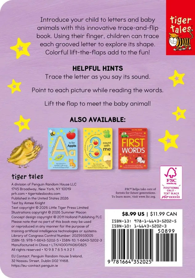Introduce your child to letters and baby animals with this innovative trace-and-flip book! Using their finger, children can trace each grooved letter to explore its shape, then open the flap on each page to see the baby animal underneath. Readers will learn each letter as they trace the alphabet, as well as practice hand-eye coordination as they open and close the flaps. Caregivers can assist by encouraging children to trace the letter as they say its sound; point to each picture while reading the words; and name another animal that begins with the same letter.