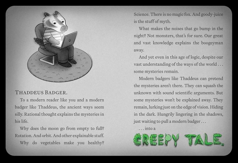 Now, Thadeus is a typical badger. He and his best friend, Oliver Possum, love burgers as much as they dislike exercise. And they hate eating veggies even more. But when they make a deal with Oliver’s parents to eat an entire salad…well let’s just say the chompers might soon become the chomped. This is a creepy tale after all and even the healthiest things can turn on you.