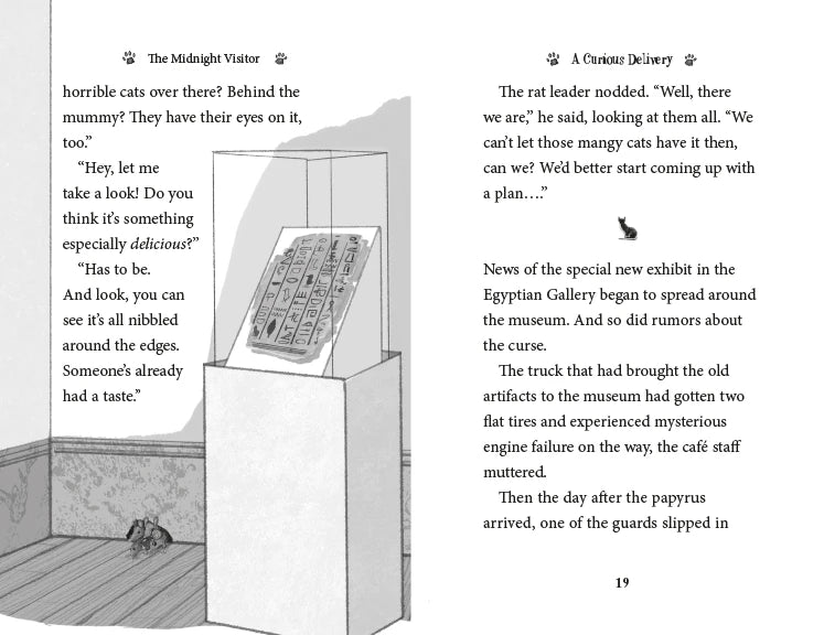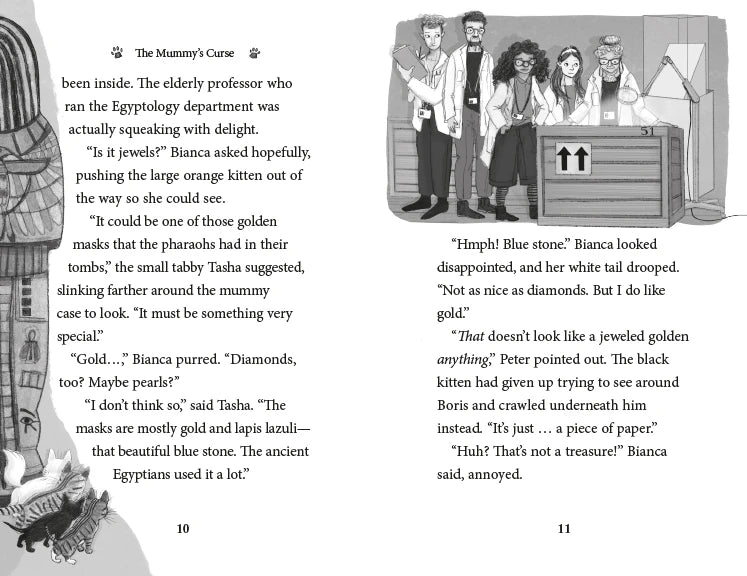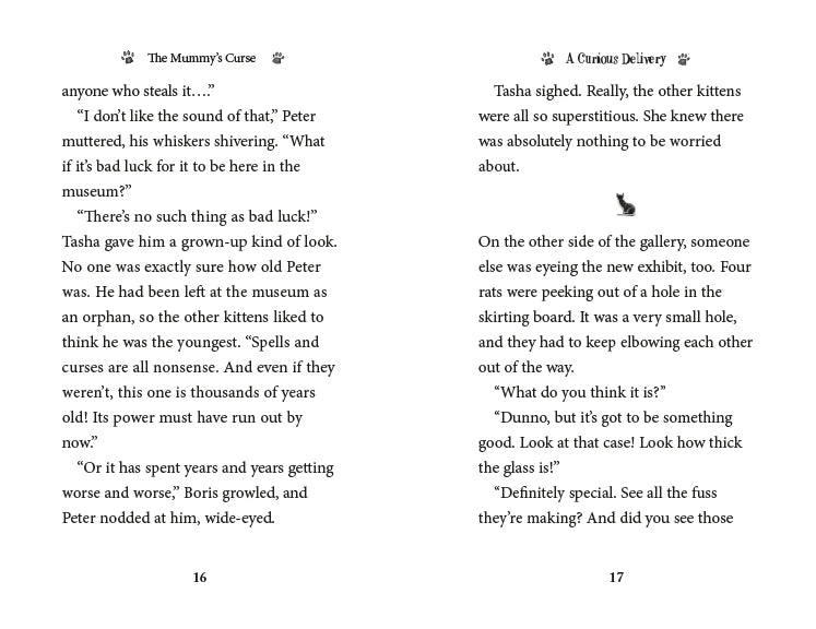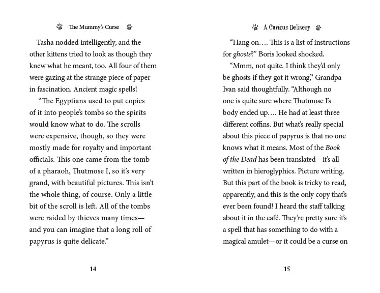 The Museum Kittens are curious when a rare Egyptian papyrus is brought to the museum on loan. But from the moment the papyrus arrives, strange things start to happen, and rumors of an ancient curse begin to spread. Tasha is determined to prove to the other kittens that there's nothing to be afraid of. Then one night, a pipe bursts, and the gallery is flooded--and the kittens are trapped! Can they figure out a way to save themselves--and all of the museum's precious objects?