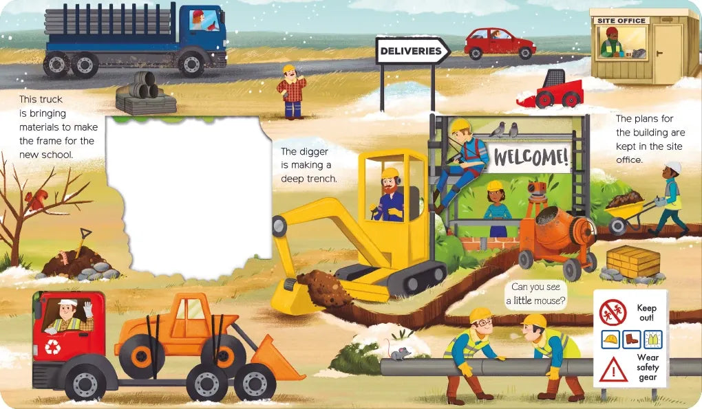Young readers will love to peek through the pages of this busy board book to discover what goes on at a construction site!
