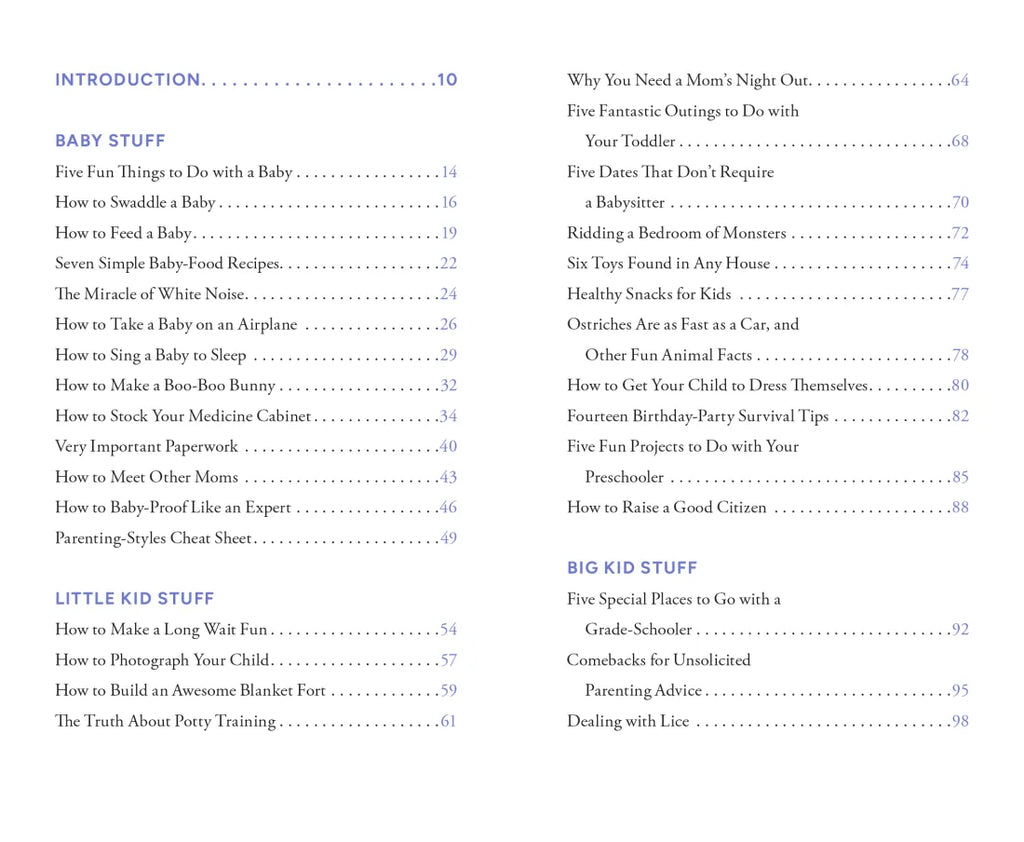 Plus suggestions for baby-proofing like an expert, tips for mastering quick and easy meals, advice on stocking your medicine cabinet, tricks to making a long wait fun, and much, much more.
