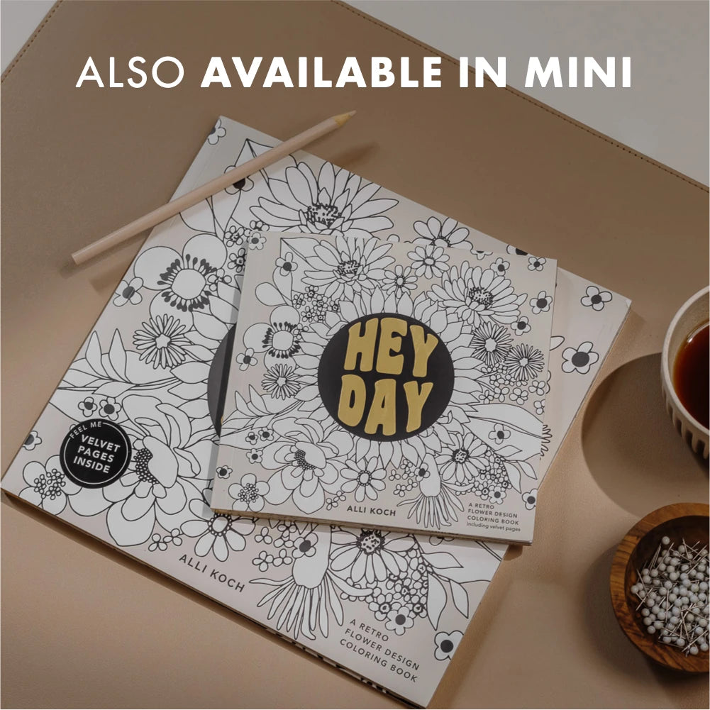 Heyday includes 40 illustrations, including bonus velvet coloring pages, hand-drawn by bestselling author and artist Alli Koch of Alli K Design. With a variety of her signature floral drawings, as well as throwback patterns inspired by the '60s and '70s, Alli invites you to bring these blank pages to life with your favorite colors.