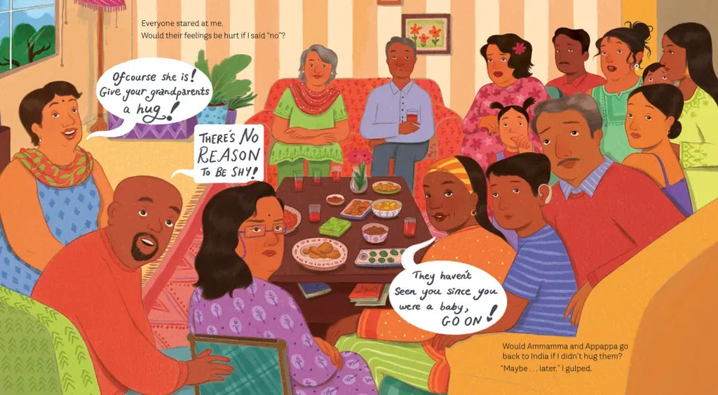 Nisha loves her grandparents, and she's excited they're here. So why does giving them a hug feel so scary? And if she doesn’t embrace them, will their feelings be so hurt that they go back to India?