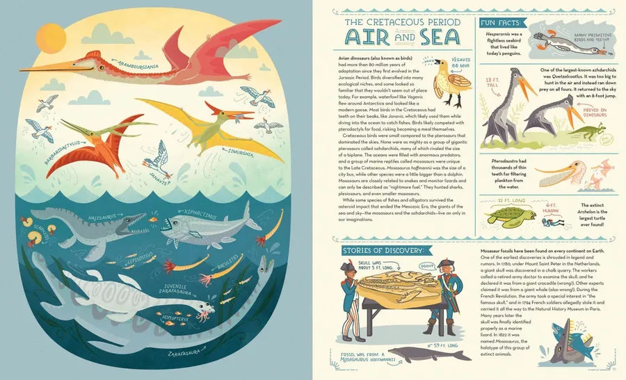 With an exciting blend of vivid artwork and astonishing scientific facts, Dinosaurs journeys through Earth’s inhospitable origins, when the only life-forms were single-celled organisms—to the beginnings of life as we know it during the Paleozoic Era: plants covering whole continents with forests, winged insects taking to the sky, and seafaring vertebrates evolving to survive on land. Traveling forward in time, you’ll explore the Mesozoic Era, when dinosaurs like the gargantuan Tyrannosaurus rex, the long-necked Brontosaurus, and the lumbering Stegosaurus walked the Earth. Then you’ll venture into the Cenozoic Era’s ice age, where you’ll meet mammals like the Woolly Mammoth and early humans.