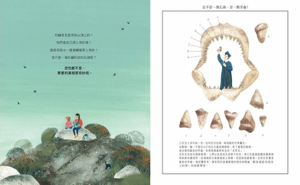 「全書沒有生硬的說教和晦澀的描述,本書從走入自然、發現山頂上有很多牡蠣開始,聽地質學家親自講述發現化石的故事,帶領孩子一起領會化石的奧秘和地質學的魔力。」