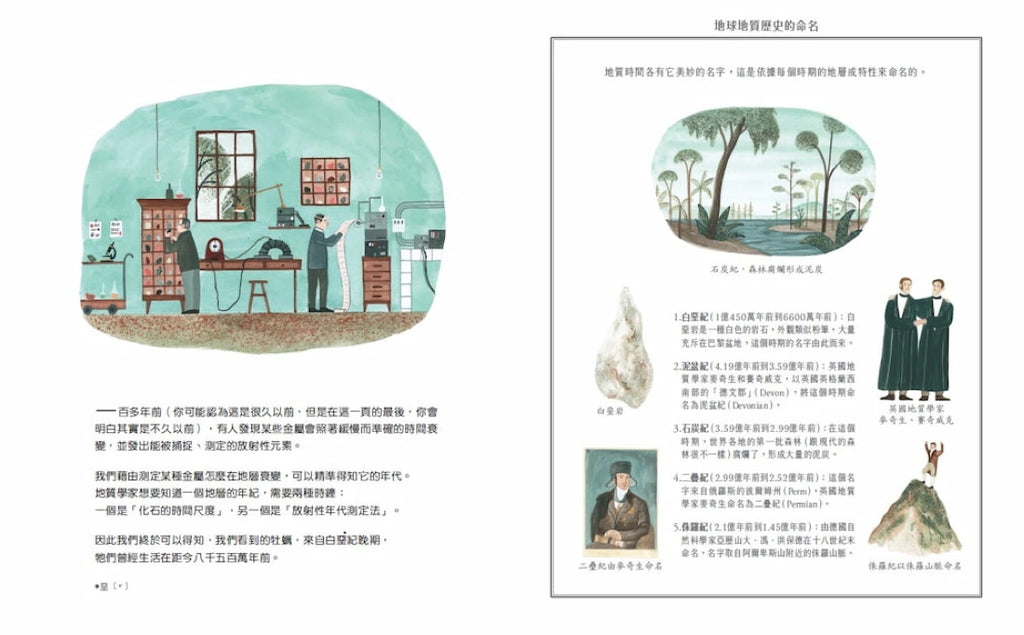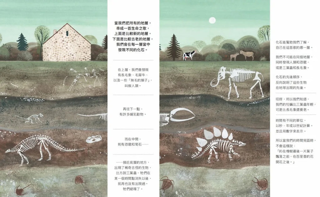 本書作者使用和朋友聊天般輕鬆的語句,透過一問一答的對話形式,讓小朋友跟著故事情節,忍不住一頁接著一頁看下去!除此之外,作者也擅於將地質學專有名詞,比喻成生活中常見的事物。例如將「礦層」比擬成樂譜上兩條平行線之間的「間」,埋藏在各個礦層中的生物,長毛象、毛犀牛、恐龍等等,則是樂譜上的符號。瞬間讓有距離感的地質學專業知識「活」了起來,不僅絕對不無聊,還能一讀就懂!