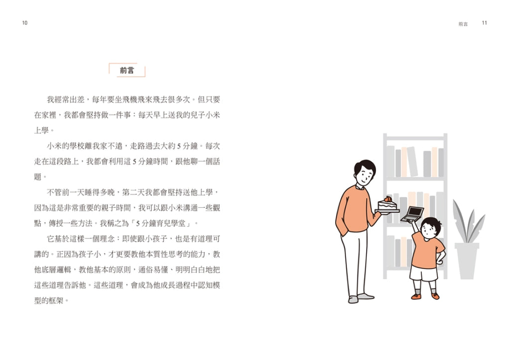 作為忙碌的商業顧問,劉潤只要在家,就一定會送兒子小米上學,並利用上學路上珍貴的5分鐘,跟兒子共同探討日常生活中的種種現象和問題,從中梳理出商業本質和邏輯,培養孩子的理性思考能力,展開一場場精彩的對話。