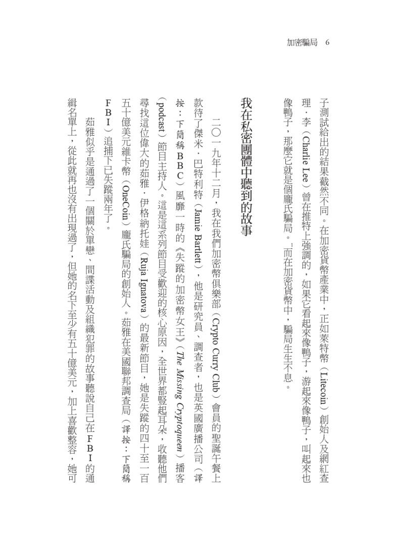「還有什麼書能讓你讀到全球最大的龐氏騙局、間諜活動、8000億美元的泡沫、詐死、加密女王、賭博和色情?─簡直就是監管機構和聯邦調查局緊追不捨的五十道陰影。艾瑞卡‧史坦福出色地分析了加密貨幣的未來,在這個世界上,包括安全支持的代幣和CBDC的真正未來才剛剛開始。」 - 鮑勃‧維格利(Bob Wigley),英國銀行業者協會主席,跨市場運營韌性小組聯席主席,英格蘭銀行董事會成員,國際貿易部和英國內政部非執行董事,兼職教授和《Born Digital》作者