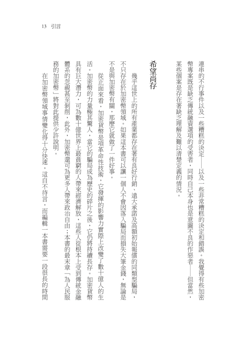 「這本書是必讀之作,特別是對於那些考慮投入加密貨幣市場的人。」 - 莎拉‧沃恩(Sara Vaughan),創新者和具有目的和積極變革的全球品牌創造者