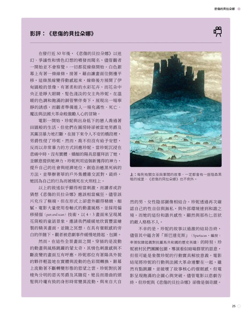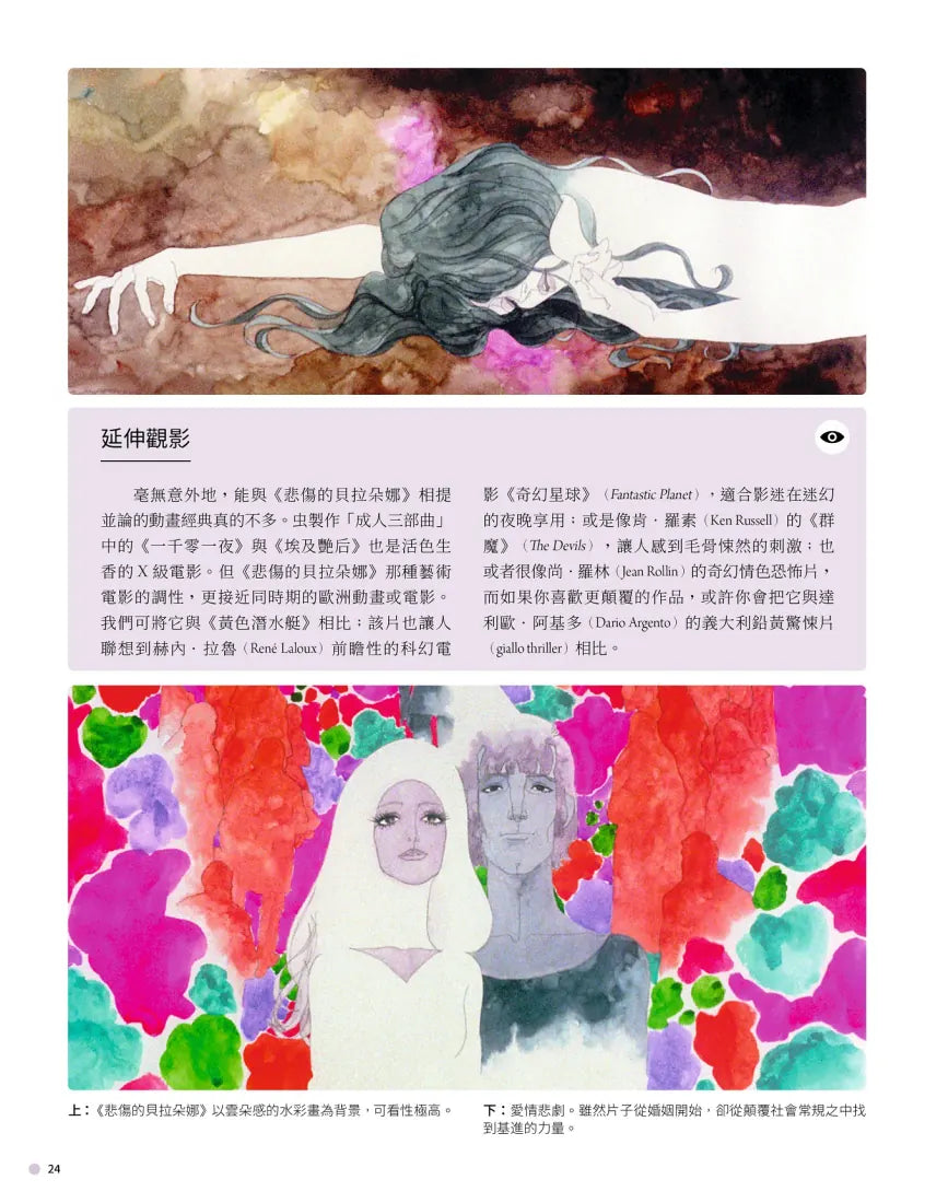 「麥可.里德與傑克.康寧漢的Podcast節目《吉卜力圖書館》(Ghibliotheque)啟迪了無數動漫迷,他們的這本著作則將目光從吉卜力工作室移開,為大家介紹同樣值得注目的30部日本動畫長片。讀者們除了可以在書中找到《阿基拉》等知名作品,亦能尋獲不少罕世珍寶,如藪下泰司早期以『東方迪士尼』為願景所打造的開創之作《白蛇傳》,以及今敏那部目眩神迷的《千年女優》。兩位作者在本書的前言中很快就指出,雖然他們所選的這30部動畫不敢說絕對完整,卻盡可能涵蓋了各種類型與風格,從卡通風格的兒童動畫,到情色、藝術風格奔放的作品,無所不包。這30部動畫橫跨1958年至2021年,依時序一一介紹。每部作品皆佔四至八頁不等的篇幅,幾乎每頁都搭以豐富多彩的劇照;而本書亦詳加追溯這些導演的職業生涯及其他重要作品,並討論這些作品的影響與價值。本書細細評析這30部動畫,許多亦列出「延伸觀影」片單。兩位作者的文字引人入勝,對日本動畫充滿溢美之情;這是一本向日本動畫長片致敬的影迷頌歌,相信能獲得廣大讀者喜愛。」