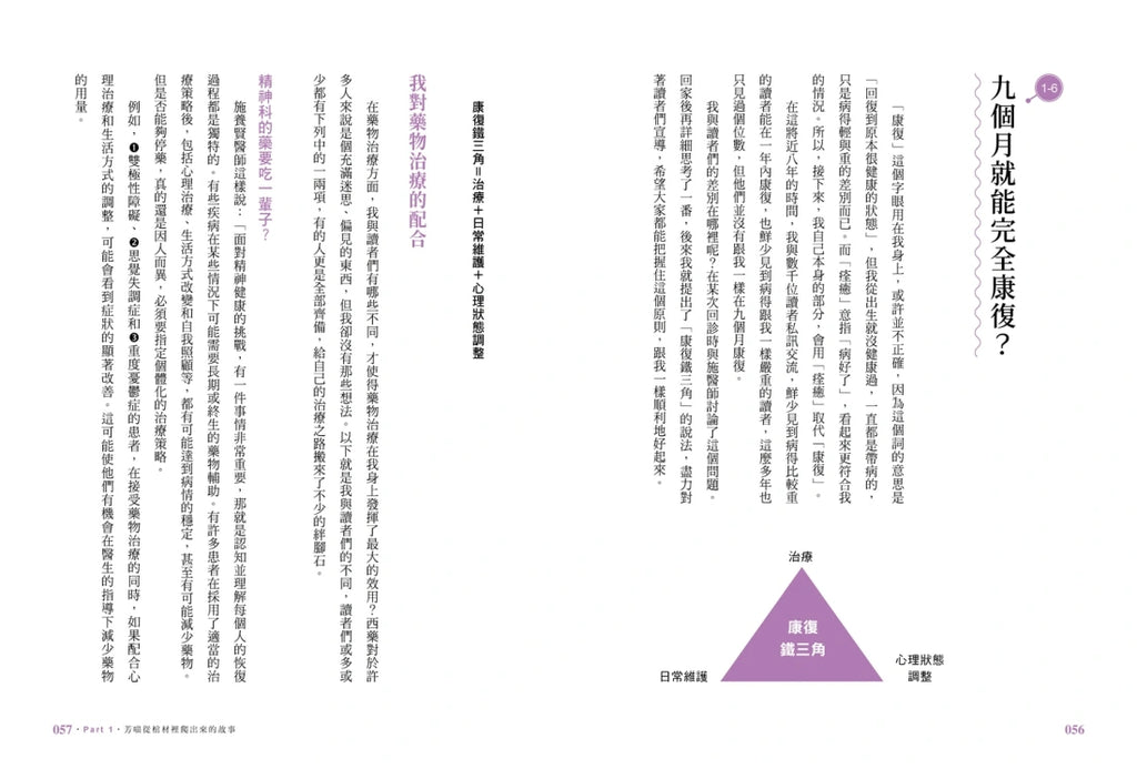 如今已痊癒的芳喵,彙集自身及3000多位讀者的經驗、身心科醫師與中醫師們的專業支援、科學研究整理等知識與資訊,以「病人的角度」詮釋這些資訊與知識,告訴你如何將之應用在康復路上的每一個決定。不僅告訴你是否該看醫生、如何找到適合自己的醫師與療法等醫病知識,更從運動、睡眠、飲食、紓壓等日常調理方法入手,溫暖地提供撐過治療期的方法,全方位照顧你的身心。