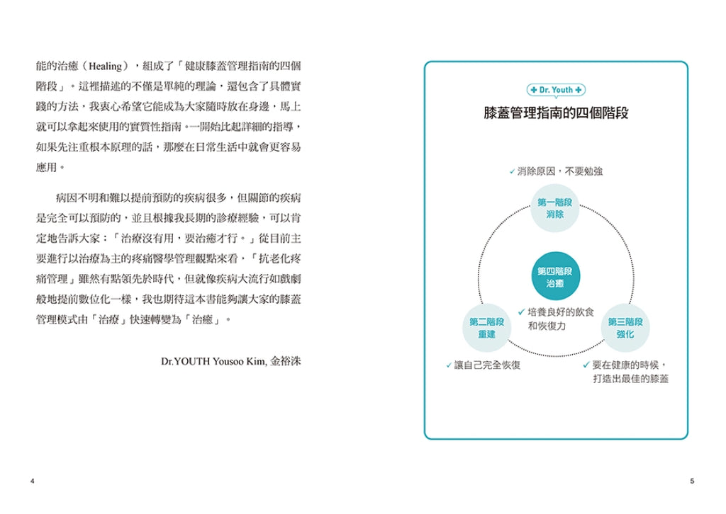 本書包含膝蓋痛的各種治療方式、復健運動、預防方法,不僅介紹了讓膝關節更強化的運動方法、還詳細地瞭解膝蓋痛的原因和症狀、如何在減少損傷的同時進行正確的復健和治療,進而加強預防、管理。