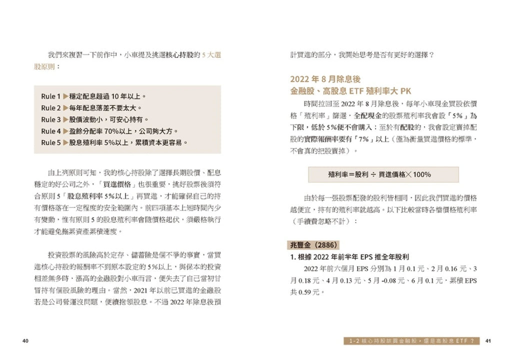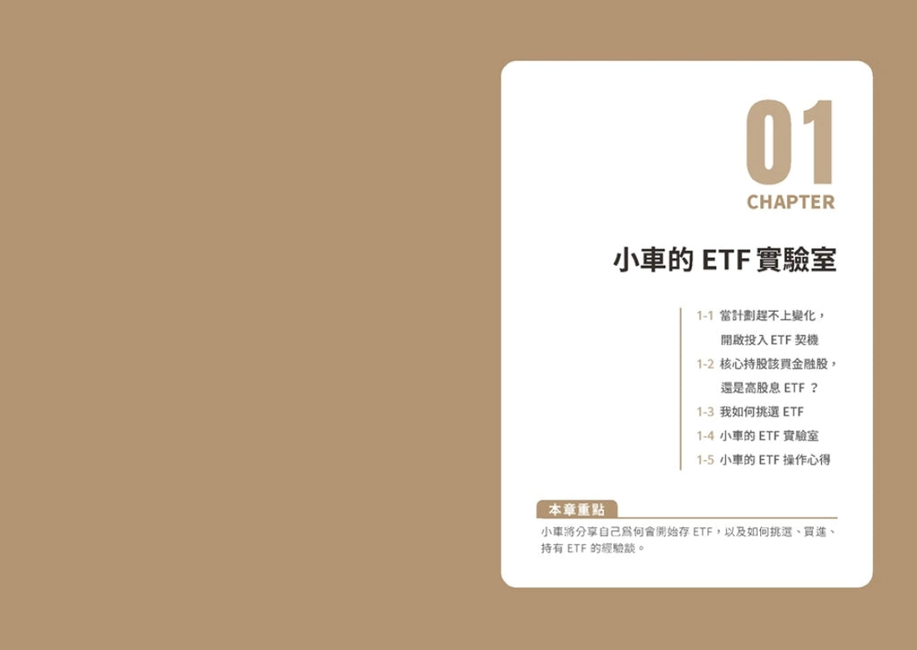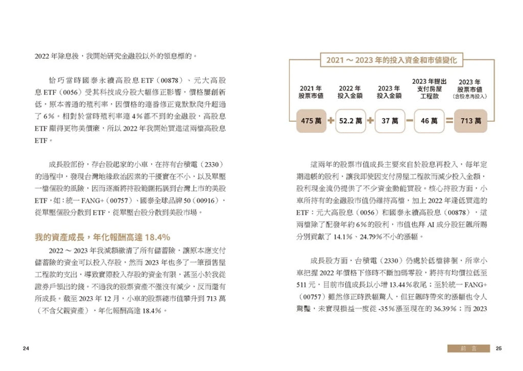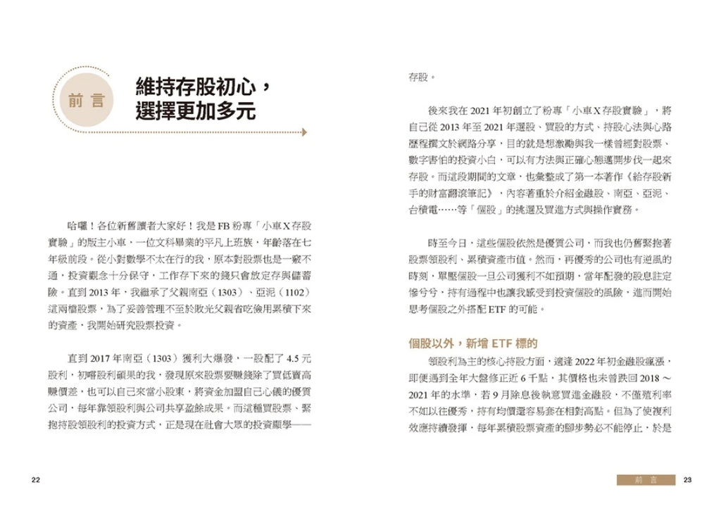 本書將分享小車在這趟旅程中,如何在當前大環境局勢不明之下,依然能讓資金藉由「ETF」以及「個股、金融股」取得豐碩的成果。